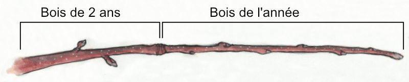 - Le bois d'un an (la croissance de la dernière saison) est le plus facile à utiliser. Idéalement, des bâtons d'environ 18" à 36" de longueur et d'environ la largeur d'un crayon (1/4" de diamètre). Ce type de bois ne se trouve plus facilement sur les arbres qui ont été taillés l'hiver précédent. Si vous n'avez pas ce type de bois, il est possible d'utiliser du bois plus ancien, mais ce n'est pas aussi facile à travailler et la fusion sera moins bonne. Évitez de prendre les rejets/gourmands issues du porte-greffe et les rameaux trop fins. Assurez-vous d'avoir des bourgeons à feuilles plutôt que des bourgeons à fruits. Les bourgeons à feuilles sont très près du rameaux.